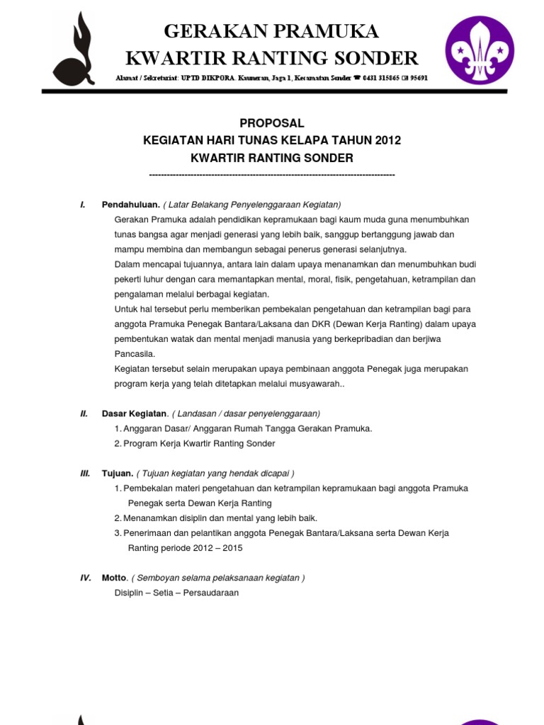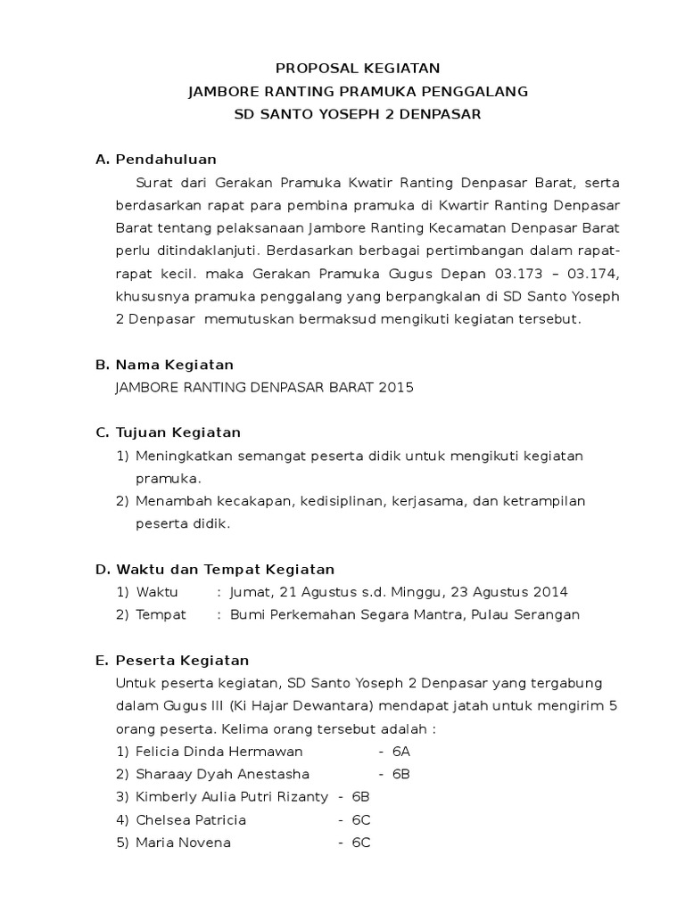Pendahuluan i.1 latar belakang gerakan pramuka adalah sebagai wadah pembinaan generasi muda yang senantiasa mengembangkan pendidikan dan. Ekstrakulikuler pramuka adalah kegiatan di luar jam sekolah yang bertujuan mengembangkan hobi dan minat. Contoh proposal kegiatan hut sekolah. Contoh proposal kegiatan pramuka, berikut ni adalah berbagai contoh proposal kegiatan contoh proposal kegiatan pramuka ke 1. Organisasi pramuka merupakan sebuah wadah yang bias menampung minat dan bakat para generasi muda.
