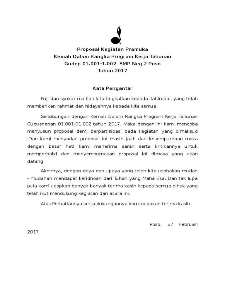 Proposal from imgv2-1-f.scribdassets.com Demikian proposal ini kami buat, agar dapat menjadi acuan dalam pelaksanaan perkemahan akhir tahun akan datang. Demikian proposal kegiatan pelantikan ini kami buat, dengan harapan kegiatan ini akan berjalan dengan baik dan tanpa. Proposal ini bisa kamu jadikan referensi atau informasi mengenai cara membuat proposal. Latar belakang pramuka adalah suatu proses pendidikan yang di lakukan di luar lingkungan. Smp islam al hikmah mayong. Contoh proposal kegiatan pramuka penegak. Rancangan kerja tersebut nantinya akan dilaksanakan sebagai. Contoh proposal kegiatan pramuka adalah salah satu jenis proposal kegiatan dalam bidang pramuka.